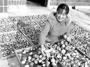 2月1日,湖北省 谷城县冷集镇刘家营村农家妇女葛忠凤正在分拣香菇。葛忠凤在冷集信用社的贷款帮助下,运用信贷员提供的信息,将过去只能当柴烧的废旧木材,经粉碎加工,消 毒杀菌,装袋点菌,种植成市场俏销、市民青睐的香菇,不出家门,便可年增收2万多元。
