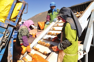 榆中甘草店镇马铃薯基地工人们正在机械化分拣洋芋。