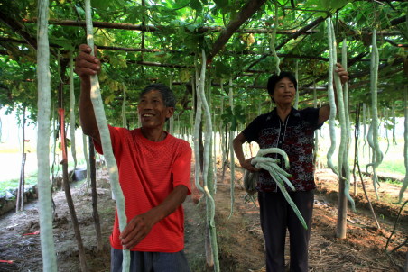 8月7日,全州县水南村农民在采摘蛇瓜。广西全州县围绕“钱粮双增”的目标,大力发展高效、生态特色农业,提高农业的科技含量,让农民在土地上“掘金”。目前,该县以西瓜、淮山、吊瓜等为主的一批特色农业种植成为当地促农增收的新亮点。