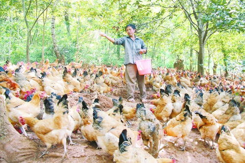 该县现有林地面积达267023公顷,森林覆盖率达62.31%。为充分利用林地资源,形成近期养鸡得利、长期得林、林农牧协调发展的良好格局,该县广泛宣传养鸡新技术、林下生态养鸡优势和经济效益,引导农民在林地、果园建立规模化生态养鸡场;发挥养殖龙头企业的带动作用,通过“公司+农户”模式,扩大农民养殖规模,提高经济收益。成立了以林业、兽医、农技等部门为主导技术服务组,积极深入养殖企业、规模养殖场和养殖户进行林下养鸡实用技术培训,为养殖户提供全方位技术指导服务;出台相关激励政策,积极协调金融部门为林农提供信贷支持。目前,全县共安排50万元贴息资金、10万元的前期工作经费用于扶持林下养鸡特色产业发展,预计全年安排贷款500万元以上对返乡农民工、留守妇女、农村创业青年给予林下养鸡项目的资金扶持,解决发展林下养殖业的资金困难。平班镇榜纳村那柳屯黄广植5兄弟利用自家50亩板栗林和茶果林发展林下养土鸡。目前,养殖规模已上万羽,养出的土鸡肉质鲜美,供不应求。