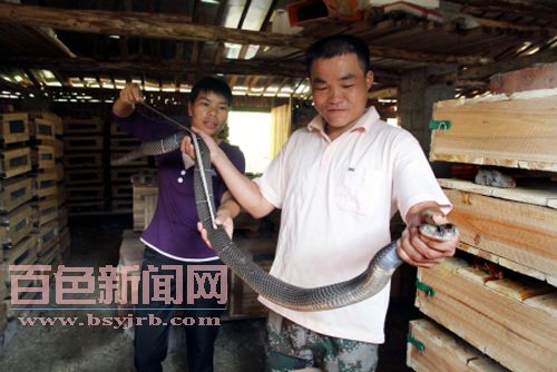 那坡县百省乡上荣屯黄俊超夫妇养蛇致富。为发展家庭经济,2008年起黄俊超夫妇从山上捡来48个蛇蛋孵化出46条小蛇后便开始了特色养殖业,三年来,他们共投入资金13万元,如今这个特色养殖场已初具规模,现养有各种蛇类近千条,已有一定的收入,计划明年发展到5000条蛇,创年纯利润50万元。