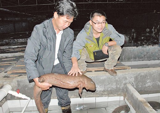 据悉,在伦文胜的带动下,凌云县岑王老山养殖娃娃鱼场现也初具规模,成为百色市右江区伦氏娃娃鱼养殖场之后的第二大娃娃鱼生态养殖场。图为伦文胜与他的 “娃娃王”。
