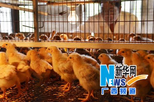 6月24日,在广西桂林市临桂县温氏养殖公司种苗场,一名技术人员在观察鸡苗。