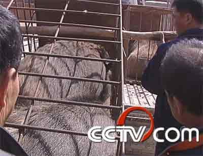国殿坤:它是一个两岁的纯野猪,这个猪到两岁以后才能配种,马上就能开始配种。记者:这个猪值多少钱?国殿坤:这个猪大约值四万元钱左右。