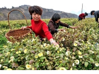 初冬时节,河北省邢台县寺子村试种的150亩杭白菊喜获丰收,农民抢抓时间进行采收。据介绍,寺子村种植的杭白菊预计亩产菊花600多公斤,每亩收入可达4000余元,为该县山区农民开辟了一条增收新路。