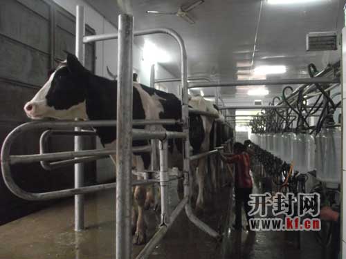 尉氏县邢庄乡坡周村饲养奶牛已有10多年的历史,目前全村拥有奶牛饲养户50家,饲养奶牛1100多头,每头奶牛每天可创纯利润20多元,村民很快走上了致富路。图为奶牛在该村现代化的奶站里接受机械挤奶。 记者 康冀楠 摄