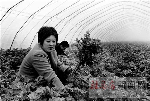 11月8日,新蔡县今是街道办事处宋圈村村民陈艳凤在温棚里采摘芹菜。近年来,该办事处利用宋圈村交通便利、邻近县城的区位优势,积极鼓励、引导村民搭建日光温棚种植反季节蔬菜,使温棚蔬菜种植成为当地农民增收致富的主要途径。 通讯员 宋超喜 王世明 摄影报道