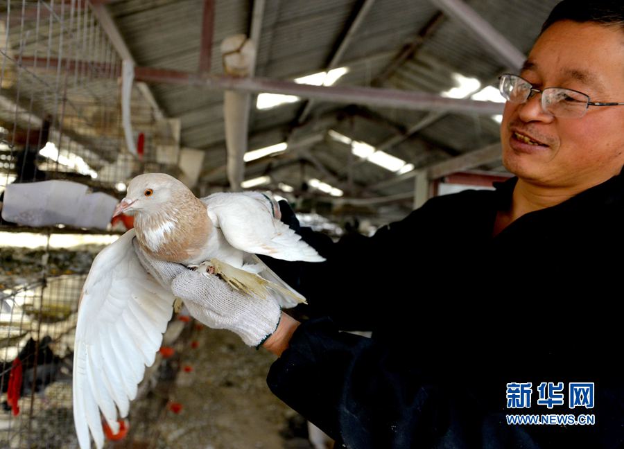 河南省夏邑县会亭镇刘齐炉村村民刘文秀、陈桂莲夫妇饲养肉鸽以及淑女、海盗球、大鼻子等观赏鸽3000多对,年出售雏鸽6万多只,收入10万多元,走上脱贫之路。新华网发(苗育才 摄)