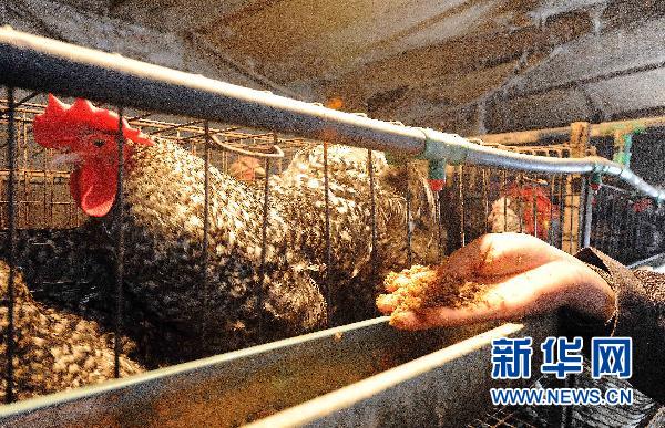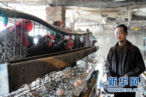 3月28日,李长顺在鸡舍中喂鸡。