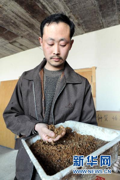 3月28日,李长顺在展示自己培养的蝇蛆。