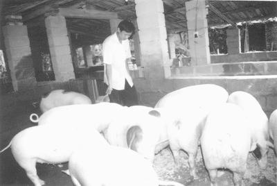 南田农场青年吕炎城,靠养猪致富,目前有猪舍40间,养猪100多头,预计今年底销售收入可达15万元。图为吕炎城在养猪。