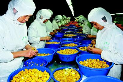 罗田首家国家农业综合开发产业化重点扶持企业——湖北华丽食品公司,每年从农户手中收购板栗近万吨,帮助全县农民增收3000多万元。公司研制推出的“栗之都”风味炒栗受到省内许多大超市欢迎,还销到了德、美、韩等国和香港、台湾地区。图为昨日该公司板栗深加工车间的工人们在精选板栗。