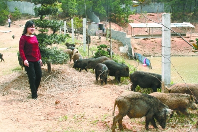 记者4月19日在涂娅莉的养殖基地看到,这些野猪喝山泉水,吃山林中的草和有机饲料,住的是基地专做的生态房。目前,涂娅莉的养殖基地总投资已达600余万元,20多亩山地院子成了“野猪乐园”。现在,来自广州、深圳的餐饮业名家纷纷前来采购,养殖基地的600多头野猪可获利100 万元。