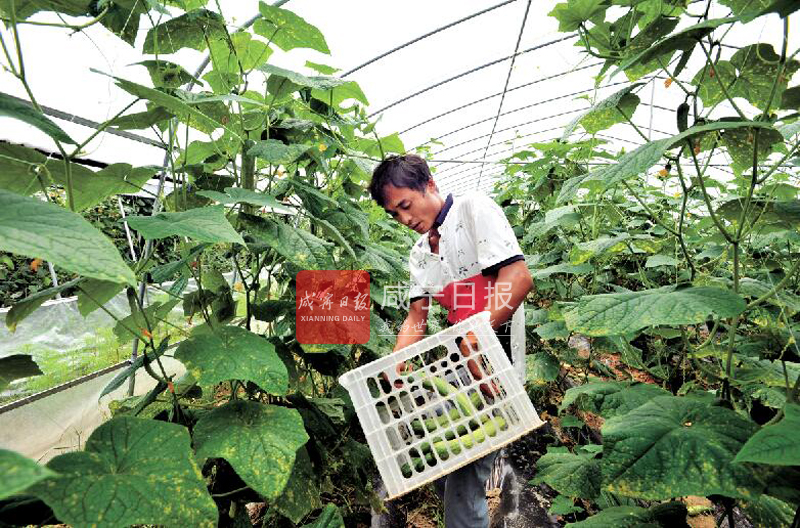6日,崇阳县港口乡石岭村,80后小伙吴理平正在蔬菜大棚内采摘黄瓜。