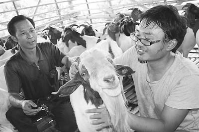 8月26日,刘湘宜(右)在家乡湖南省邵阳县下花桥镇合兴村的养殖场里忙碌着。2006年毕业于华中理工大学的刘湘宜曾赴尼日利亚工作。2008年他带着从国外学到的技术回到家乡,引进南非波尔山羊养殖,当起了洋羊倌。目前他的波尔山羊最大的一只重达75公斤,已为养殖户提供种羊200余只,带动当地部分大学生和返乡农民工养殖就业。