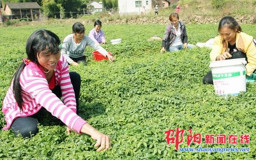 10月19日,绥宁县武阳镇毛坪村,村民黄喜梅(前左一)正带领姐妹们采摘绞股蓝鲜叶。向喜梅是该镇远近闻名的“绞股蓝种植大户”,去年,她在自家的山坡和自留地种植了3亩绞股蓝,收入近3万元。今年,她家扩大种植面积和规模,种植了8亩绞股蓝,估计年收入将达到10万元以上。