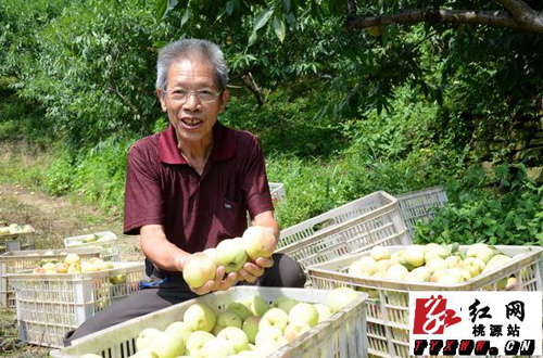 在热市镇乃至桃源县,黄玉庭可是个响当当的人物。退休前,他是衡阳铁路法庭的庭长,退休后,黄老放弃在城市安享晚年,回到了故乡桃源。回到山河村,本想找儿时的伙伴回味一下过去的岁月,可是看到当时大部分村民还只有靠传统耕种养家糊口时,一股责任在黄玉庭的心底感油然而生,那就是带领大家找一条致富的路子。可是山河村没有矿产,只有长满了茅草的高山,上什么项目呢?经过多方考察,黄玉庭选择种植桃树。为了保险起见,2001年,黄玉庭先试着种植了100亩,他说,这100亩就是试验田,要让老百姓信服,就必须让他们看到实效。黄老不懂技术,他一切从头学起,边干边学。功夫不负有心人,2004年,这100亩桃树挂满了果子,煞是喜人,而且平均亩产1000多斤。初试成功,黄老干劲倍增,他不停地开荒种桃,一年、两年、三年。一座座山头变绿了,一片片桃林挂果了。经过十多年的发展,黄老的果园面积达到了1000余亩,并且带动不少村民种植脆蜜桃。由于黄老的脆蜜桃远离污染源,种在海拨500米的山上,不打药,用夜光灯灭虫,加之脆蜜桃香、脆、甜、美、耐储藏、好运输的特点,每到鲜桃成熟季节,就有长沙、株洲、衡阳、张家界、常德等地的客商前来购买。