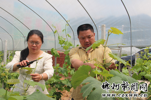 在寨前镇富竹生态蔬菜专业合作社的蔬果基地里,一行行整齐的红提树挂满了红提,黄文斌与妻子在修剪树的枝叶。