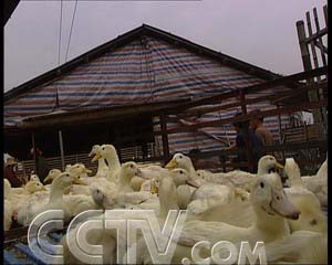 很多村民到蔡吉祥那里看热闹。蔡吉祥把从小鸭苗到大鸭棚做成八个不同的大小,这样一来就可以节省很多空间,鸭子也比原来养的多一些。