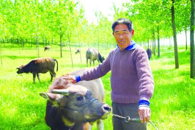 灌云县东王集乡合兴村农民充分利用河床草源丰富的优势,大力发展家庭养殖业。目前,该村百分之七十的农户从事养牛、养羊、养鹅等家庭养殖。今年,合兴村八组农民王玉平放养了十头牛犊,到年底可净增收入三万元。图为王玉平在河床放牧。