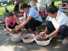 近年来,野生蝉猴成为江苏省丰县的一大产业,由于蝉猴营养丰富,市场畅销,价格连年上升。当地一些农民经纪人把蝉猴收购上来后,通过加工销往全国大中城市,蝉猴成为当地农民增收致富的法宝,每年可为农民增收100多万元。图为该县农民正在市场上销售蝉猴。