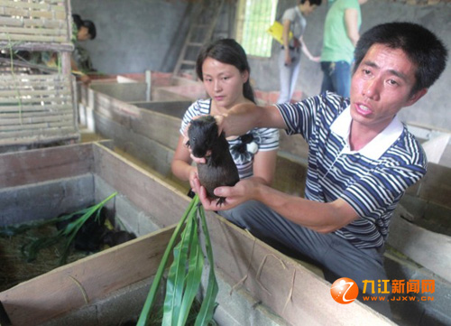 王斌是德安县宝塔乡梅桥村人,在外打工期间,他专门到一家黑豚养殖场自费学习养殖技术。去年下半年,他从广西买来10对种黑豚,在自家开始了试养殖,成为我市第一个养殖黑豚的农户。据王斌介绍,今年底,他的黑豚养殖数量可达到1000只。他表示,以后会教乡亲们养殖黑豚,共同致富。图为9月1日,王斌夫妇在观察黑豚的养殖情况。