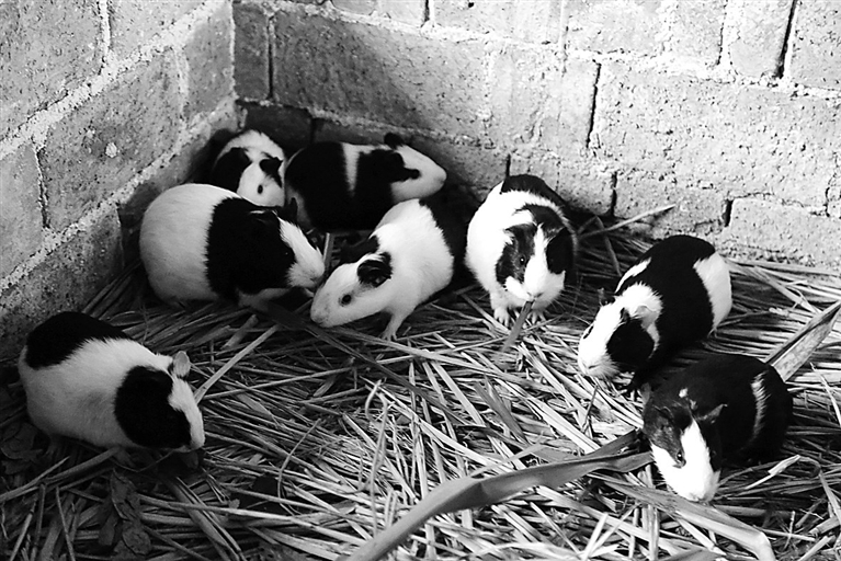 走进邱欣贵的豚鼠养殖场,里面圈养着活蹦乱跳的豚鼠,小小的耳朵长相机灵,四肢短小,看着有点像老鼠,可却没有尾巴。别看这些小家伙油光锃亮、悠闲自在。可一旦见到陌生人,它们会警觉地发出尖利的吱吱声,要么四处躲闪,要么挤作一团,煞是可爱。邱欣贵告诉笔者,这些豚鼠比较好养,吃的食物不讲究,主要吃青草,是一种集野味、毛皮、观赏、滋补于一体的珍贵食草动物。