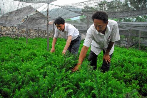 在宽甸白石砬子国家级自然保护区附近的大川头镇新丰村农民谷得富家种植的3万多棵东北红豆杉长势喜人。保护区管理局派出技术专家为周边农民提供东北红豆杉种植技术指导和服务,引导和带动周边农民发展东北红豆杉种植产业致富。