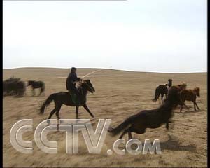 这是内蒙古赤峰市阿鲁科尔沁旗的一处牧场,牧场的主人叫斯日吉噶瓦,2007年5月18日一早噶瓦带着牧场里的工人们训起马来。每年的这个时间,牧场里都会经历这样一段人仰马翻的艰难时刻,但是这一刻对噶瓦来说也是最重要的。因为5月份是噶瓦牧场销售旺季。他都要在客商来草原买马之前把蒙古马训老实,方便顾客挑选。