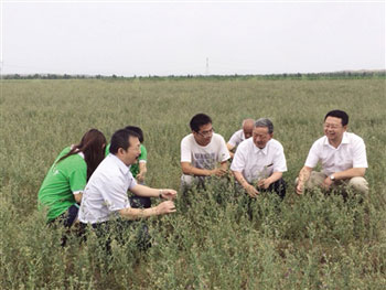 图为张振华(左四)向中国工程院院士傅廷栋(右二)介绍苜蓿特性和今年收获情况