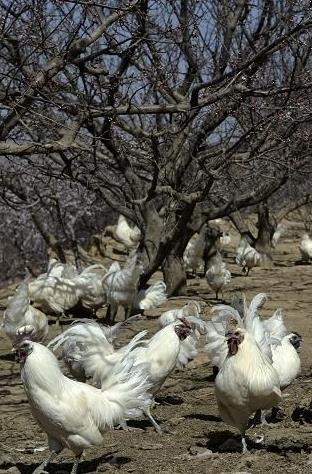 在宁夏彭阳县阳洼流域一处生态鸡养殖点,农户在给鸡喂食。宁夏彭阳县地处黄土高原中部丘陵沟壑区,在退耕还林、生态移民等政策的引导下,该县森林覆盖率由建县初的3%提高到如今的24.8%。近年来,宁夏彭阳县依托林地优势,大力发展林下散养生态鸡,注册“朝那鸡”品牌,采取“公司、合作社、基地、农户”的产业化经营模式,开辟了50处养殖点,年生态鸡饲养量超过100万只以上,直接经济收入4000余万元,在林区初步呈现出“户户林下养鸡”的生产格局。
