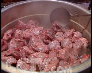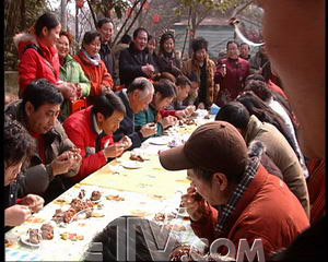 宣贵琼:“搞一次啃兔脑壳比赛,然后我就花了800元钱,在华西都市报打广告吸引城里面的人来,让城里面的人来晓得我这个地方的兔头好吃,让他们来买我们的兔脑壳。”