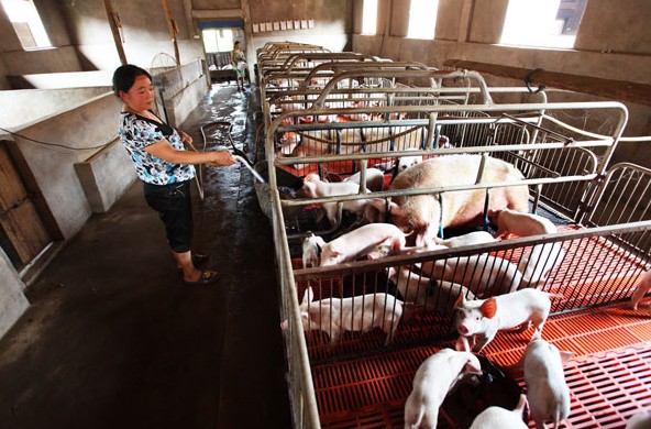 通江县围绕农民实施致富产业建设小农水项目。图为铁佛镇小岭子优质肉猪繁育养殖场用水清洗圈舍。 记者 付海旭 摄