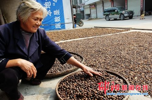 10月24日,绥宁县鹅公侗族苗族乡的一位老大妈正在自家屋前空地上晾晒油茶果。近年来,该县充分利用有利地势地貌发展油茶产业,加大对油茶的种植和改良,今年全县的15.6万余亩油茶获得丰收,如今,油茶已经成为该县农民致富的支柱产业之一。
