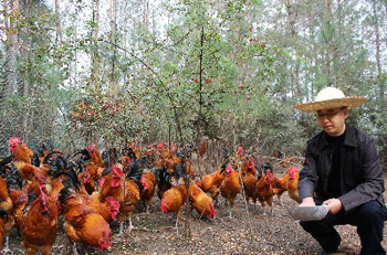 图为邱大梁在“丘处鸡生态农场”饲养放养土鸡