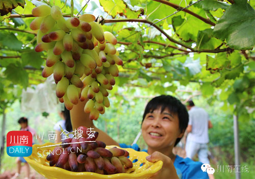 “采摘期从6月一直持续到12月,农场也展现出了三大特色,这也是我们的初衷。”据殷凤琴介绍,目前,葡萄园实现了“新”、“奇”、“特”三大特色:“新”即品种新;“奇”即葡萄最大如鸡蛋,最小如豌豆,早晚熟时差长;“特”即园内有种巨无霸,一串可长到一米来长,重达20余斤。