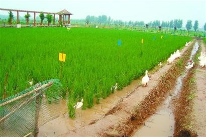图一:吴家堡有机米生产基地里放养的鸭子正在捉虫子。