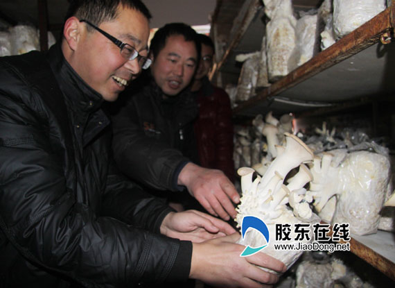 胶东在线网2月10日讯:2月9日,农历正月初七,大多数人还在走亲访友,烟台栖霞市农机办技术人员就来到蛇窝泊镇文石村林伟的杏鲍菇生产基地里查看杏鲍菇长势。2号菌种室的育菌架上,一株株杏鲍菇已经顶破外层的塑料薄膜,长势良好。林伟高兴地拿起一株指给技术人员看:“头茬早已卖光了,一斤7块多。二茬长得也是相当好,效益真是没说的!”