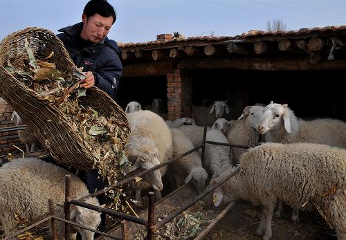 12月22日,刘世荣在给自家养殖的山羊喂饲料。
