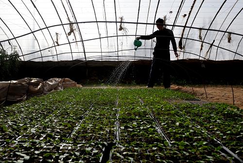 12月22日,刘世荣在进行黄瓜苗的培育。