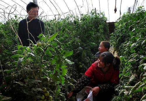 12月22日,刘世荣(左)在和妻子张粉叶一起采摘自家大棚里的反季节蔬菜,他家每年的温室大棚收入有近5万元。