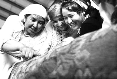 6月24日,新疆于田县先拜巴扎镇女致富能手芒来西汗(左一)在指导学员学习织毯技术。2008年,芒来西汗投资建起了地毯编织、民族刺绣培训基地。截至目前,该基地已开办培训班18期,培训学员1000多人,拓宽了当地群众致富增收的渠道。
