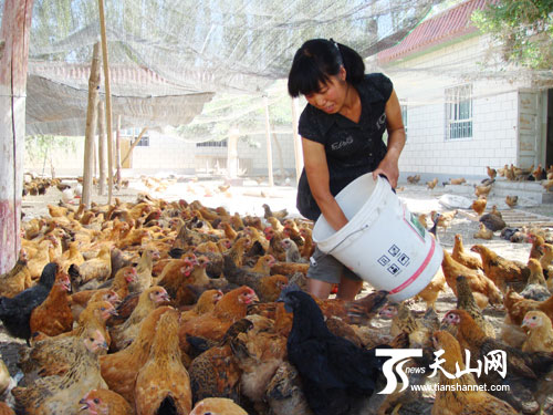 天山网讯(通讯员汪安明摄影报道)7月18日,农二师三十三团一连王玲正在给散养土鸡填料,她兴奋地告诉笔者,在连队计生协会给她贴息贷款 10000元的帮助下,今年她散养七彩山鸡2000只、土鸡2000只,8月中旬可出栏,计划全年出栏成品鸡10000只,年收入将达20万元。