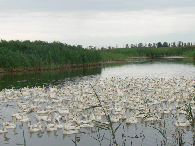 曲曲弯弯的柳河沟里,芦苇丛生,水波荡漾,万余只大白鹅畅游在河沟里,时儿钻上,时儿钻下,互相嬉戏着,原来这是新疆生产兵团农七师一二五二十连职工文传进饲养的11200只大白鹅。据悉,这个连职工抓住兵、师、团党委鼓励职工发展庭院经济的好政策,瞅准了被遗忘了的柳河沟这个地缘优势,投入资金从四川购买回白鹅一万多只进行饲养,成为该连敢吃“螃蟹”的庭院经济养殖大户,目前,第一批5000只商品大白鹅将上市。图为白鹅在水中畅游时的镜头。