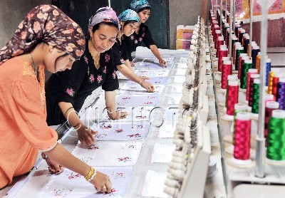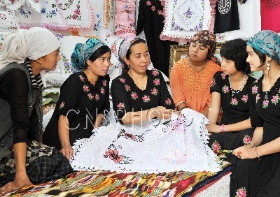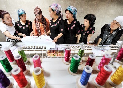9月10日,新疆叶城县喀格勒克镇海热古丽? 阿布都热扎克(中)在给学徒讲授刺绣技术。海热古丽? 阿布都热扎克从事刺绣行业20多年,目前投资20多万元购置刺绣设备从事订单手工业生产,解决就业300多人,并成立刺绣协会带领家庭妇女共同致富,年销售额达30多万元。