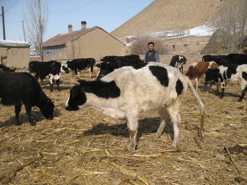 9月18日,新疆生产建设兵团农八师一四三团紫泥泉哈萨克族牧民伯斯汗正在检查育肥牛生长情况。伯斯汗喂养育肥牛采用放牧与圈舍饲养相结合的方法,使育肥牛生长发育格外快,每年都要向市场出售育肥半100多头,获利8万多元人民币,使伯斯汗靠喂养育肥牛走上了致富路。图为伯斯汗喂养的育肥牛。