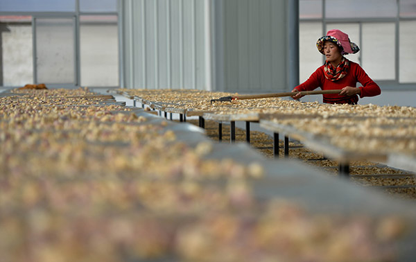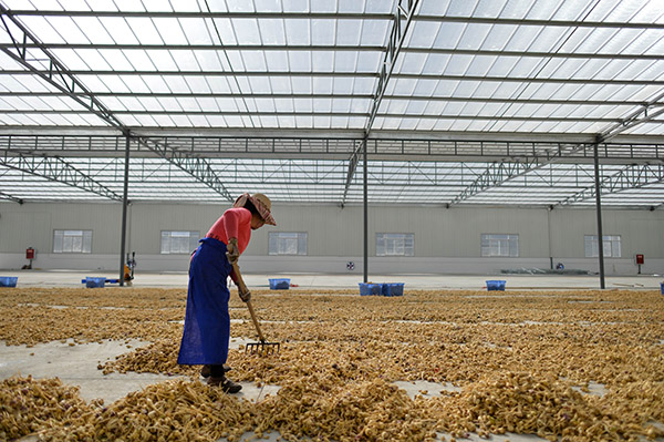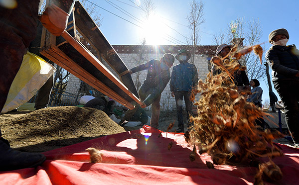 11月17日,在曲水县玛卡加工厂,工作人员在晾晒玛卡。