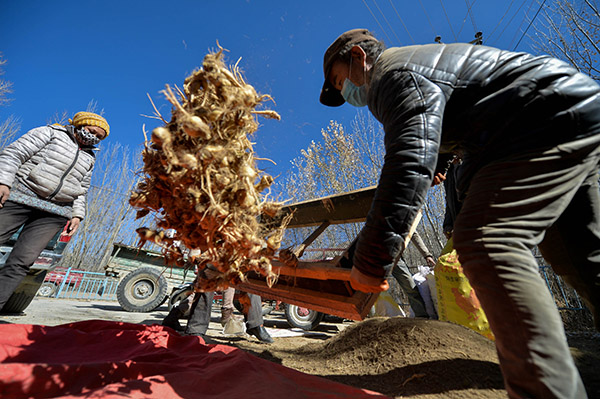 11月17日,在曲水县才纳乡,当地农民将收获的玛卡拿到收购点售卖。