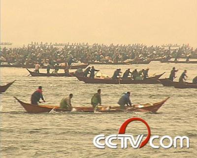 8点30分,开湖捕鱼准时开始,渔民们憋了一年的力气全都使了出来,争先恐后往湖中心划去,生怕去晚了就捕不到鱼。不到20分钟,所有的渔船就散布在近40平方公里的湖面上,开始下网捕鱼。