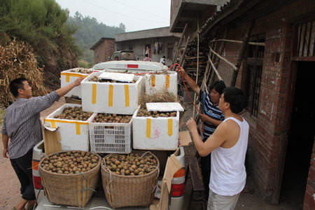 坚持就是胜利,付出就会有收获。今年,邓云川精心种植的红心猕猴桃进入了试挂果的第一年,春天来临的时候,猕猴桃树枝上一片片雪白的花朵开的格外亮丽,浓浓的花香随风飘散,令人心花怒放,邓云川暗暗窃喜,料想今年应该会是丰富年。谁知花期刚结束就遭遇了1个多月的干旱天气,而进入夏天又遇到了严重的伏旱,高温持续的天气对果子生长造成了严重影响,看着受干旱影响的果子,邓云川心里有说不出的痛。虽然果园里修建了几个水窖,但附近的村民饮用水困难,邓云川不得不牺牲果园而先满足村民的吃水问题。由于水源不足,果园大部分果子因缺水果型小而生长不好。但能想到的办法,邓云川尽力而为,从技术和管理上加强,确保果子能正常生长。到了收获的季节,虽然产量不尽如人意,但还是有不少收获。9月5日,邓云川迎来了首位泸州水果批发商购走了140件猕猴桃,卖出了2万多元。邓云川说,他们将水果分成了特级、一级和等外级,其中特等果批发价能卖出25元/斤的价格,一级果能卖到20元/斤,等外果则能卖出7-8元/斤。由于猕猴桃品质好、营养价值高、口感好,深入消费者喜爱,目前,市场供不应求。他们从9月2日开始聘请工人采摘,每天能采摘到1500斤左右,采摘期将会持续到半个多月。他们将采摘后的水果运送到临时修建的冷库进行保藏,保存期将达到3至4个月。水富一家水果店看中了邓云川的水果后主动与他联系,成为红心猕猴桃的代购点。